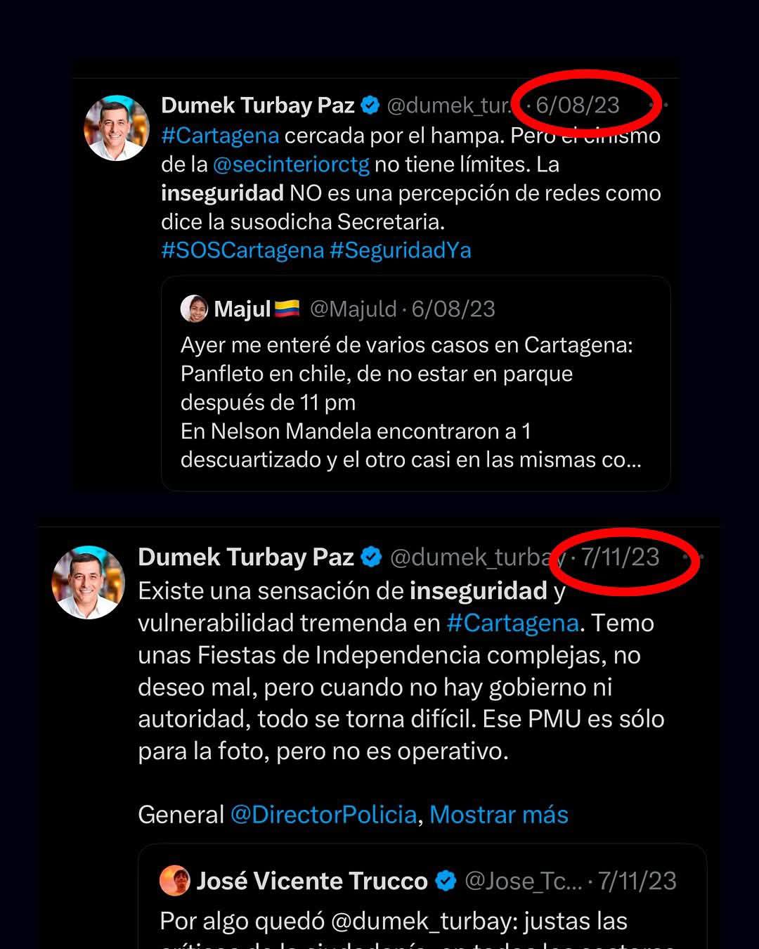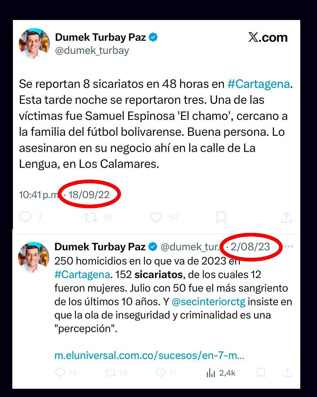 La memoria de las redes sociales no perdona. Hoy, cientos de usuarios le están recordando al alcalde de Cartagena, Dumek Turbay, sus vehementes críticas de campaña contra la administración anterior por la falta de resultados en materia de seguridad. Entonces, contaba uno a uno los sicariatos, cuestionaba al secretario del Interior y exigía acciones concretas frente a la violencia en las calles. Hoy, ese discurso parece haberle dado la vuelta… como un bumerán.